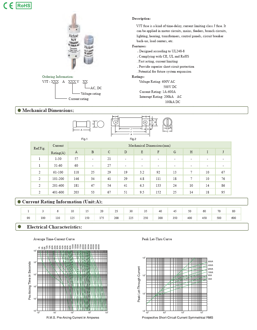 VJT fuse is a kind of time -delay, current limiting class J fuse. It can be applied in motor circuits, mains, feeders, branch circuits, lighting, hearing. transformers, control panels, circuit breaker back-uo, load centers, etc.