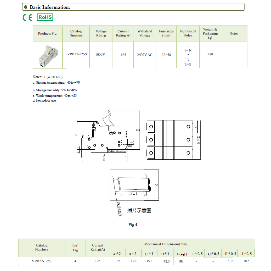 电流:125A,电压:1000V,适用熔断器:22x58mm