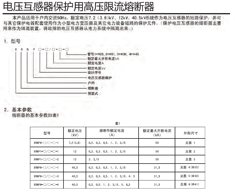 本产品适用于户内交流50Hz,额定电压7.2(3.6)kV、12kV、40.5kV系统作为电压互感器的短路保护,并可